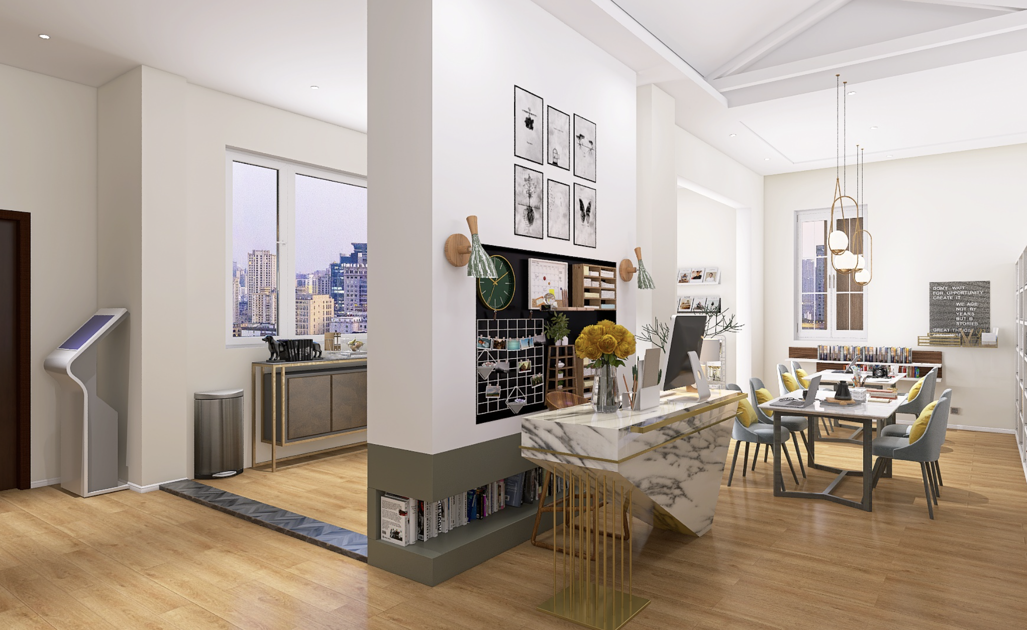 • Una oficina moderna con escritorios de mármol, sillas amarillas y paredes decoradas con cuadros verdes y florales, con ventanas grandes que dejan entrar luz natural.